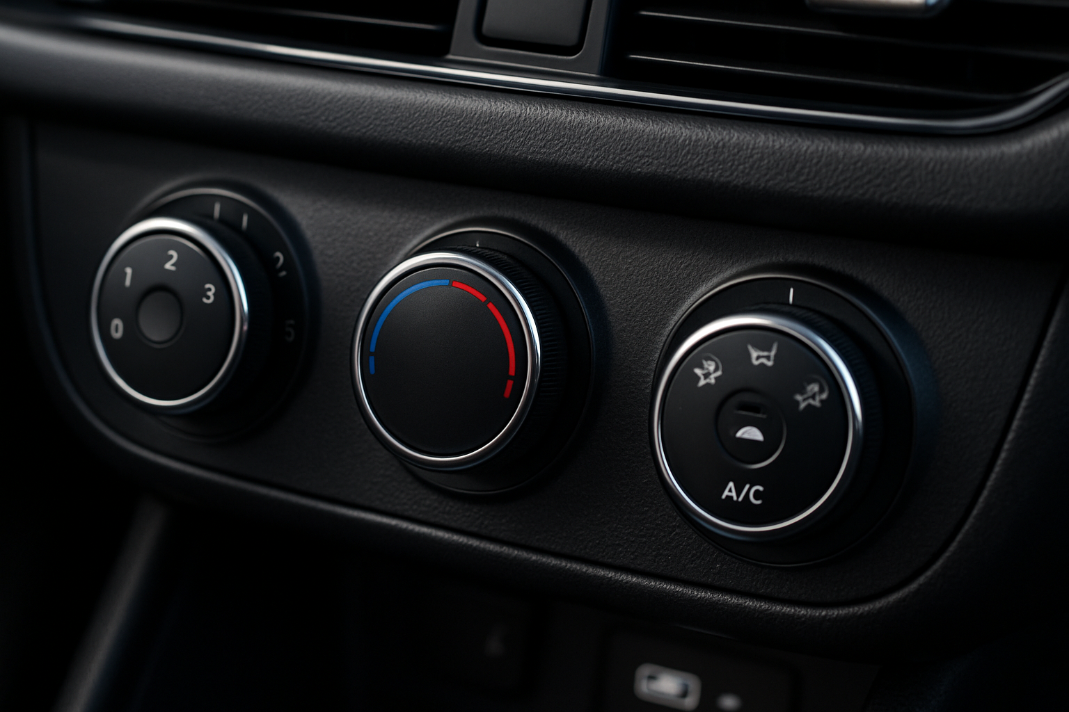 Le réglage de température se fait habituellement avec une molette rouge et bleue. La zone bleue envoie de l’air froid tandis que la zone rouge diffuse de l’air chaud provenant du moteur. Sur les véhicules équipés de climatisation, un bouton A/C distinct active le compresseur de froid.