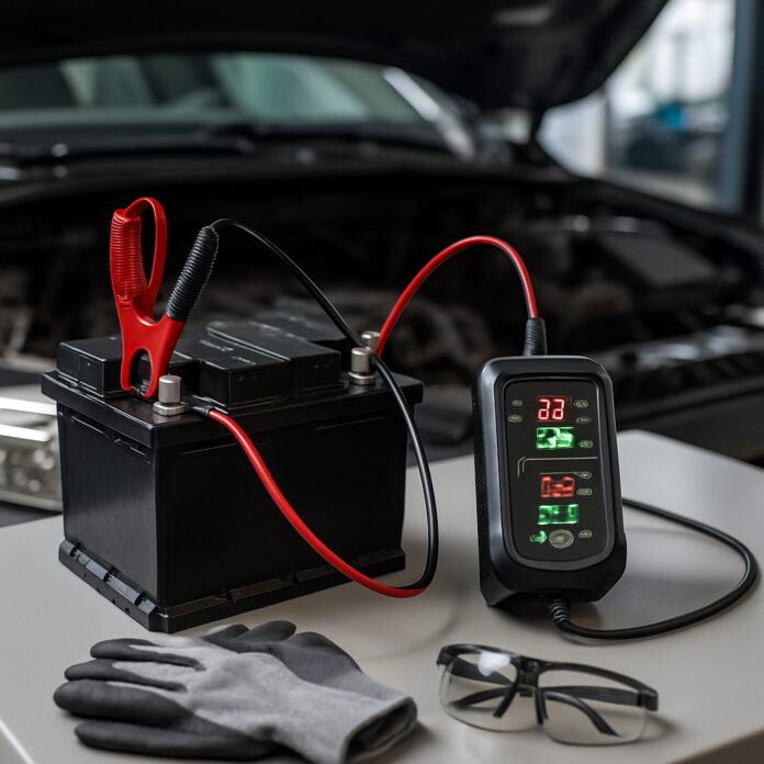 Pour charger une batterie de voiture avec un chargeur, vous devez d’abord couper le moteur et retirer la clé de contact. Connectez le câble rouge du chargeur à la borne positive de la batterie, puis le câble noir à la borne négative. Réglez l’intensité de charge selon la capacité de votre batterie (généralement 10% de sa capacité en ampères), branchez le chargeur sur secteur et laissez charger jusqu’à ce que le voyant indique la fin du cycle. Cette opération demande entre 6 et 24 heures selon l’état de décharge.