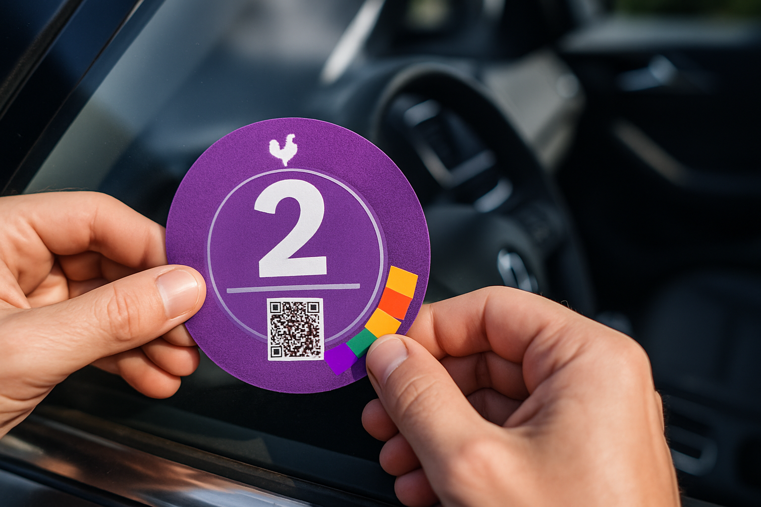 Dès réception, collez l’autocollant de manière visible sur la partie inférieure droite du pare-brise, côté intérieur. Pour les deux-roues motorisés, fixez-la sur la fourche avant ou sur le garde-boue. L’emplacement doit permettre aux forces de l’ordre de vérifier facilement la classification sans descendre du véhicule.