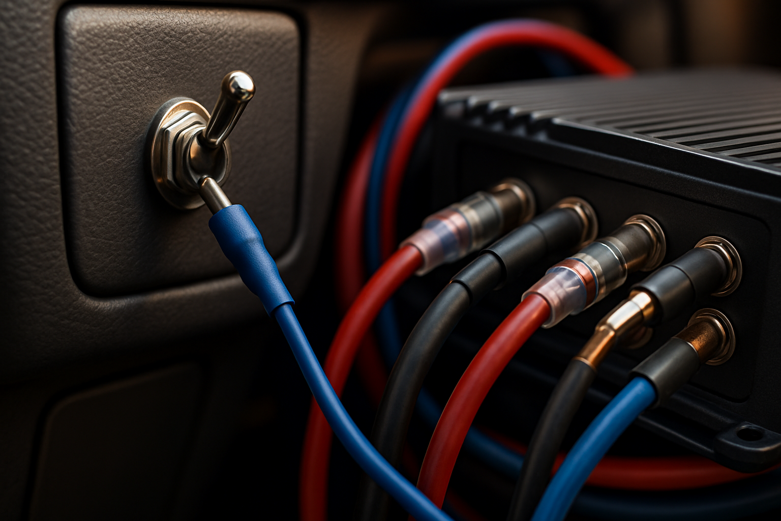 Assurez-vous que tous les câbles supportent l’intensité requise. Un amplificateur de 500W nécessite des sections de câble adaptées pour éviter toute surchauffe. Le choix d’un interrupteur de qualité automobile garantit une durabilité optimale face aux vibrations.