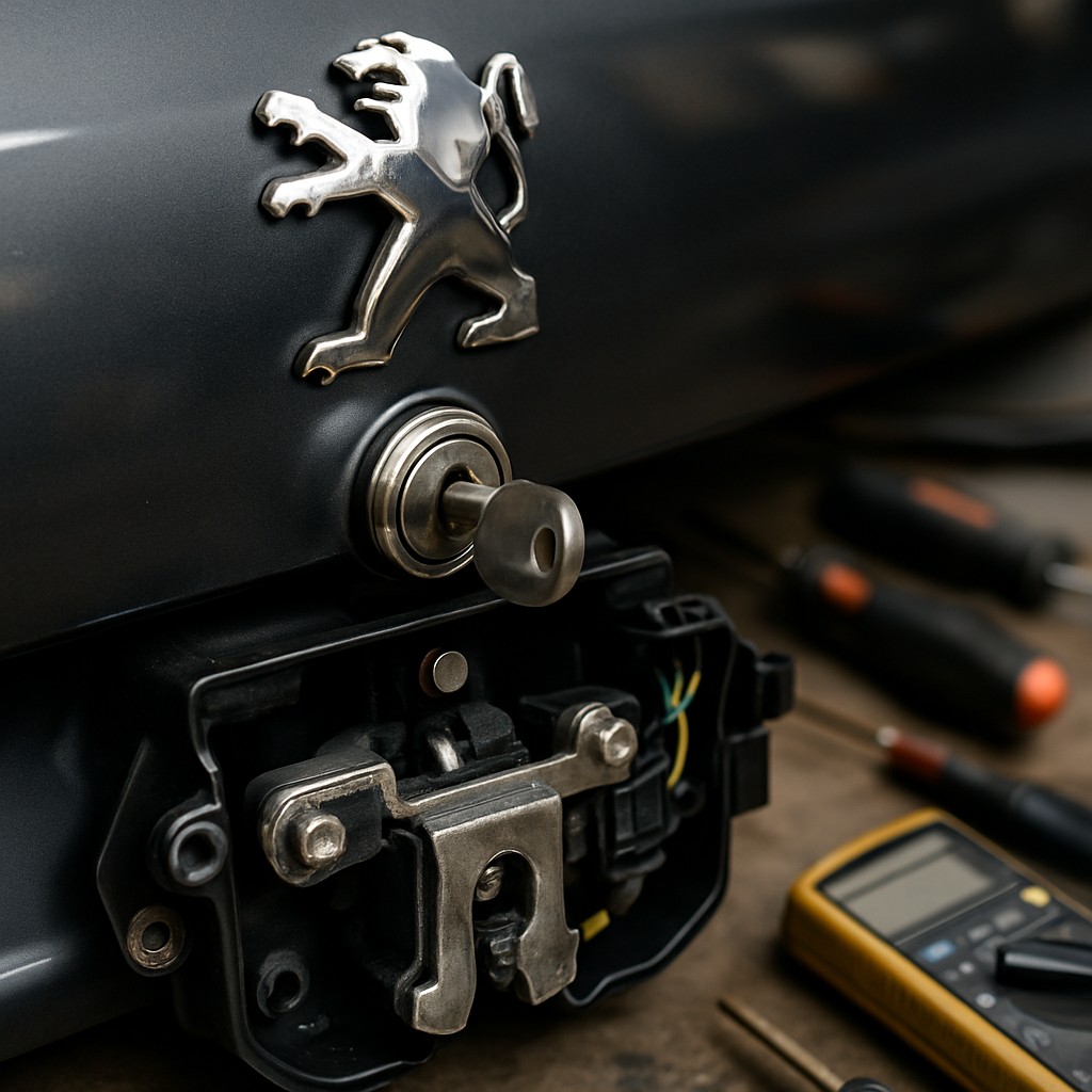 Pour ouvrir le coffre de la Peugeot 407 bloqué, vous pouvez utiliser la clé mécanique cachée dans le boîtier de la télécommande, actionner manuellement le mécanisme depuis l’intérieur via la banquette arrière rabattable, ou débloquer le verrou électrique en vérifiant le fusible, la batterie et les connexions électriques du système de verrouillage central.
