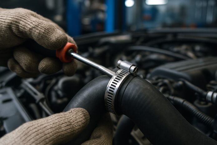 Le type le plus courant présente une bande métallique dentelée et une vis de serrage. On le reconnaît facilement grâce à la petite vis visible sur le côté du collier. Ce modèle s’utilise fréquemment sur les durites de refroidissement et les conduits d’admission d’air.