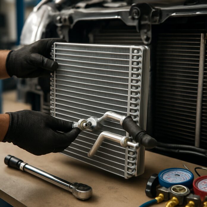 Le condenseur se situe devant le radiateur moteur et refroidit le gaz chaud pour le liquéfier. L’évaporateur est installé dans l’habitacle derrière le tableau de bord et transforme le liquide en gaz froid qui absorbe la chaleur. Les deux sont essentiels au cycle frigorifique.