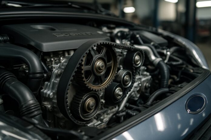 Présence de fissures ou de débris : Si vous ouvrez le capot et remarquez des petits morceaux de caoutchouc noir près du carter de distribution, c’est un signal d’alarme. La courroie se désagrège.