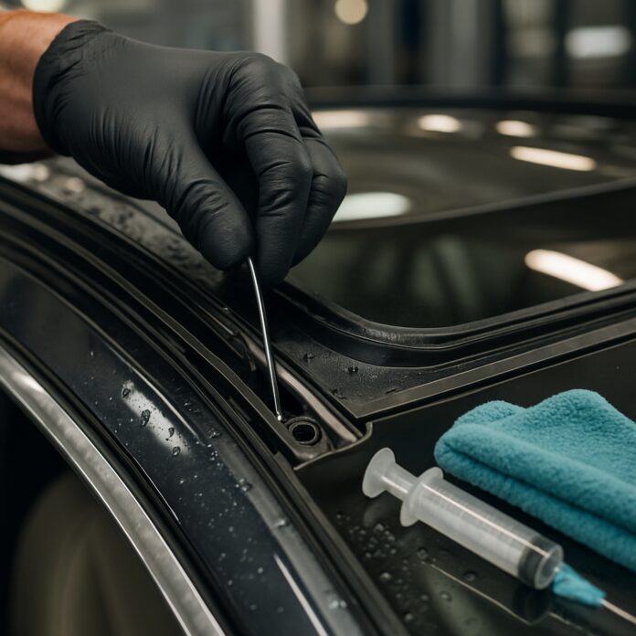 Versez lentement de l’eau dans les rails du toit ouvrant avec une bouteille. Observez si l’eau s’évacue correctement par les drains situés aux quatre coins du cadre. Ces canalisations traversent les montants de la carrosserie et débouchent généralement au niveau des passages de roues.